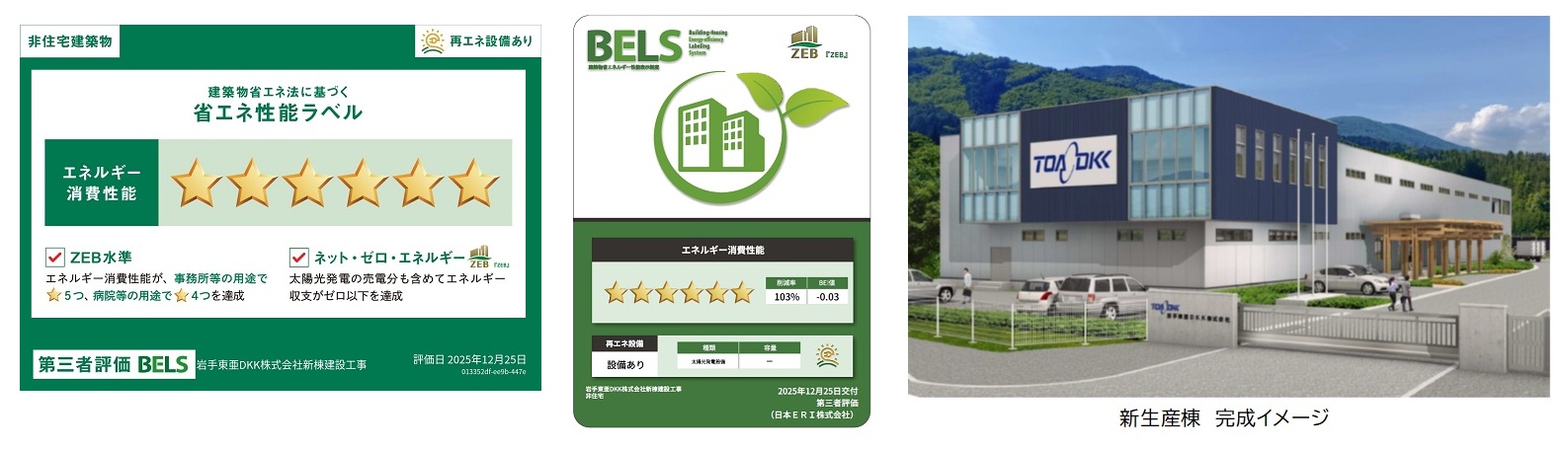 当社の生産拠点である岩手東亜DKK株式会社(本社:岩手県遠野市、代表取締役社長:羽毛田靖)は、現在建築中の新工場棟において、再エネ活用と省エネ対策でエネルギー削減率100%を実現したことで、第三者機関より、ZEB(ネット・ゼロ・エネルギー・ビル)認証の最上位となる「ZEB」認証およびBELSの最高評価である6スター(☆☆☆☆☆☆)を取得しました。